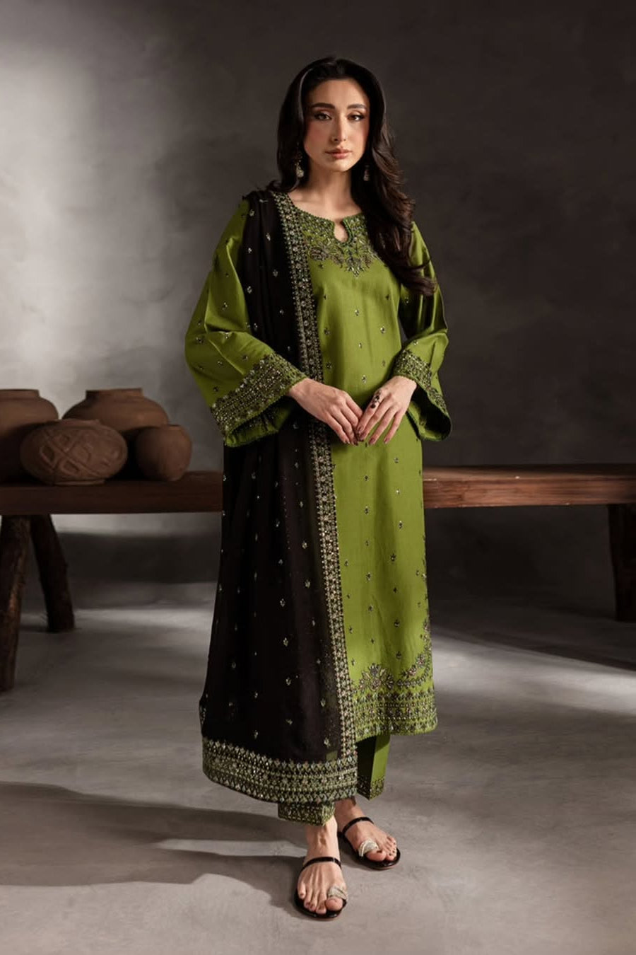 Capture timeless elegance with the Olive Allure 3-Piece Dress, a sophisticated ensemble designed for the woman who appreciates refined style and effortless grace. Crafted from premium fabric, this dress features exquisite embroidery and a comfortable, flowing silhouette, perfect for a variety of occasions. The rich olive green hue brings a touch of earthy sophistication to your look, ideal for both daytime events and special gatherings. Complete with a beautifully embellished black dupatta, this outfit is sure to enhance your wardrobe with its understated beauty.